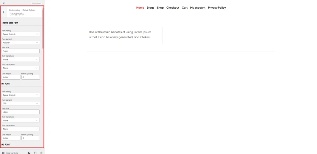 The Typography settings in the Global Options panel allow you to fine-tune the font styles used throughout your website. You can customize the base font, heading fonts (H1–H6), and paragraph text by selecting the font family, weight, size, and additional styling options like text transformation and letter spacing. These adjustments help maintain a consistent and visually appealing design that aligns with your brand identity.